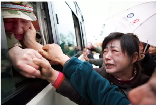 开往部队的汽车即将启程,不舍的母亲再也抑制不住自己的眼泪,她只能贪恋似的抚摸着儿子稍显稚嫩的脸庞,哭成了一个泪人。
