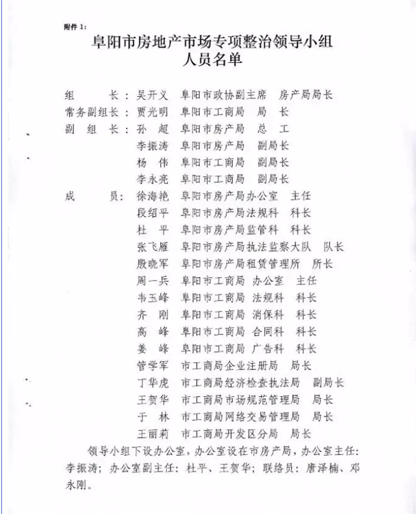 据了解,本次专项整治工作将成立阜阳市房地产市场专项整治领导小组。由市政协副主席 市房产局局长吴开义任组长,市工商局局长贾光明任常务副组长,孙超、李振涛、杨伟、李永亮任副组长,相关科、室、局负责人任成员,办公室设在市房产局。